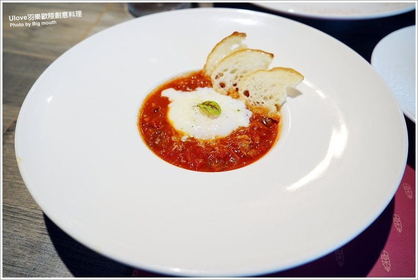 ▼另一道開胃小點為番茄牛肚牛筋水波蛋,採用牛肚、牛筋、自製辣醬、帕達諾起士、番茄等下去煨煮而成,上頭以水波蛋點綴,再搭配法式麵包,可以單吃或是搭配麵包享用!