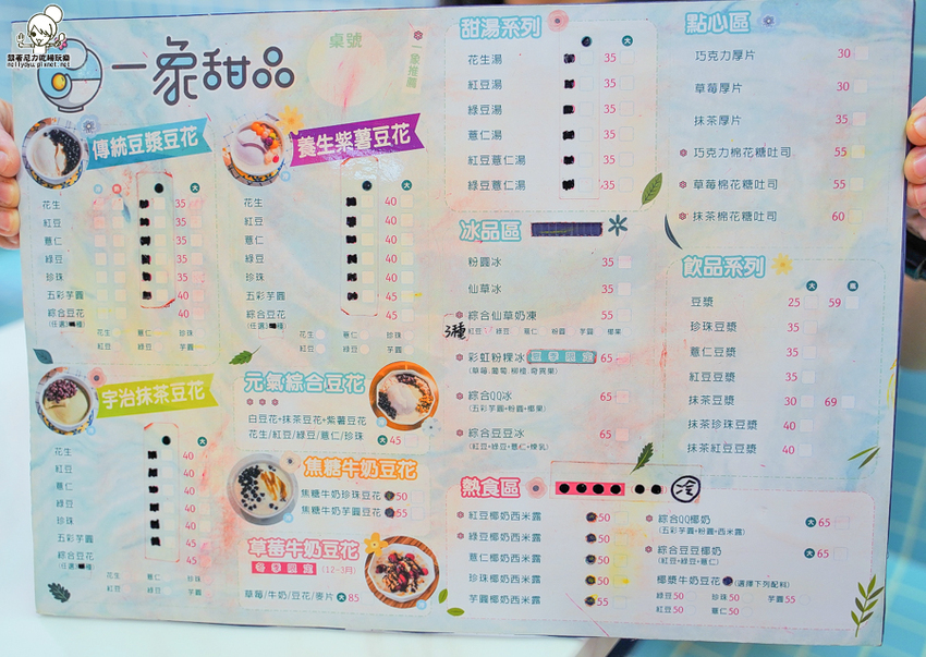 一象甜品 菜單,全部都是50元銅板左右的豆花、粉粿、甜品