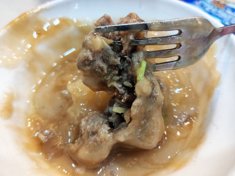 肉圓一顆40元的價格還OK,不過個頭普通不算大,最特色的是皮好Q啊,看起來略偏白色的外皮有點像清蒸會有的外表,但其實是油炸的,所以又有油炸的Q彈感,覺得很特別,皮可以拉很長XD,感覺都快要有點麻糬的口感了,很不錯。