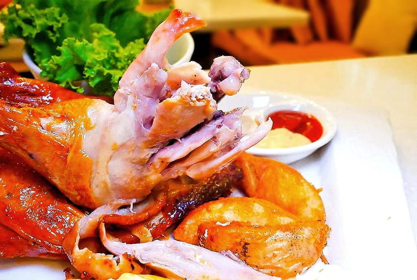 套餐有碳烤奶油半雞.韓式甜生菜.帶皮黃金脆薯,盤子上貼心附上手套.雞肉直接撕來吃或是沾醬吃, 口感都很不錯!