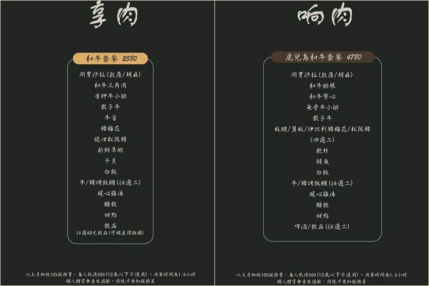 想肉燒烤有每人低消500元,服務費10%另計,12歲以下兒童免低消。菜單上還會提醒套餐裡有海鮮,個人體質會過敏者需留意,若不要海鮮可更換成豬梅花一份。我們體驗的是牛豚雙人套餐1980元,內容有:開胃沙拉、豬梅花、豬五花、脆口松阪豬、牛胸腹肉、板腱牛、翼板牛、嚴選雞腿、新鲜草蝦、干貝、白飯、烤飯糰、暖心雞湯、醋飲、甜點、飲品。甜點三選二和49元飲料可在單點菜單內的挑選,店家其它菜單已置於文末,歡迎參考。