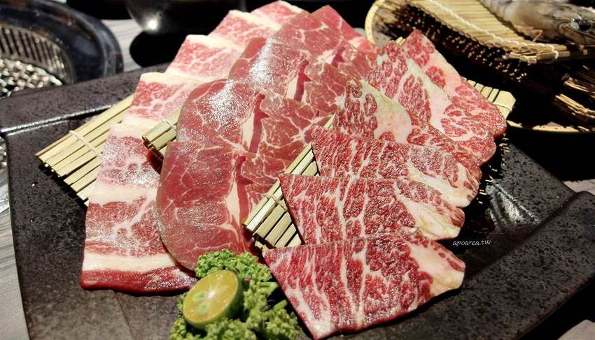 牛肉有三品,牛胸腹肉油花明顯,油脂香氣豐富,瘦肥層疊超適合燒烤;板腱牛中間有筋膜,肉質吃起來較紮實有嚼勁。翼板牛有較為勻稱的油花,口感類似牛小排,軟嫩潤喉,非常好吃!