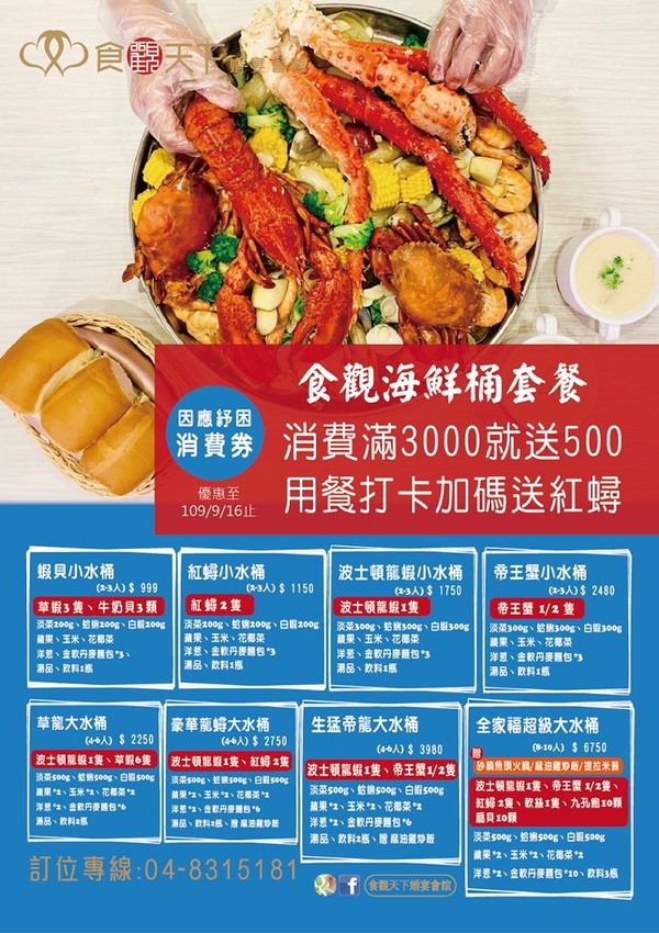 員林美食,食觀海鮮桶套餐,呼叫海鮮控來聚餐囉!彰化員林知名的婚宴會館「食觀天下」,除以婚宴桌菜聞名,最近主打風靡泰國一直很夯的豪邁手抓海鮮桶,不用拿刀叉筷子,隨心所欲用手抓來吃,過程超有趣!超大隻龍蝦海鮮盤必吃!整體價位不高且餐點品質和服務都很棒,最近小潔發現這家「食觀天下」,讓你免飛出國到東南亞,就能宛如置身異國大嗑美食,非常推薦大家來到員林旅遊時列入必吃美食清單之一喔!GO!