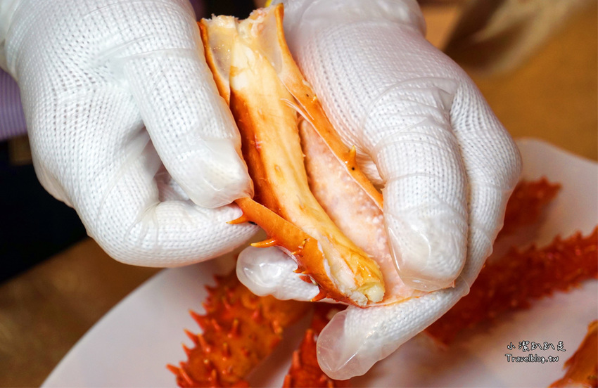 帝王蟹腳剪開後肉質非常緊實飽滿,哇!小潔光聞到新鮮蟹肉的香氣就口水一直滴啦。