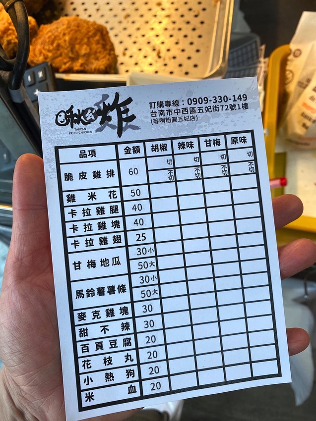 《啾ㄠˊ炸雞》單價都很便宜,最便宜的只要$20元,最貴的雞排 也只要$60元