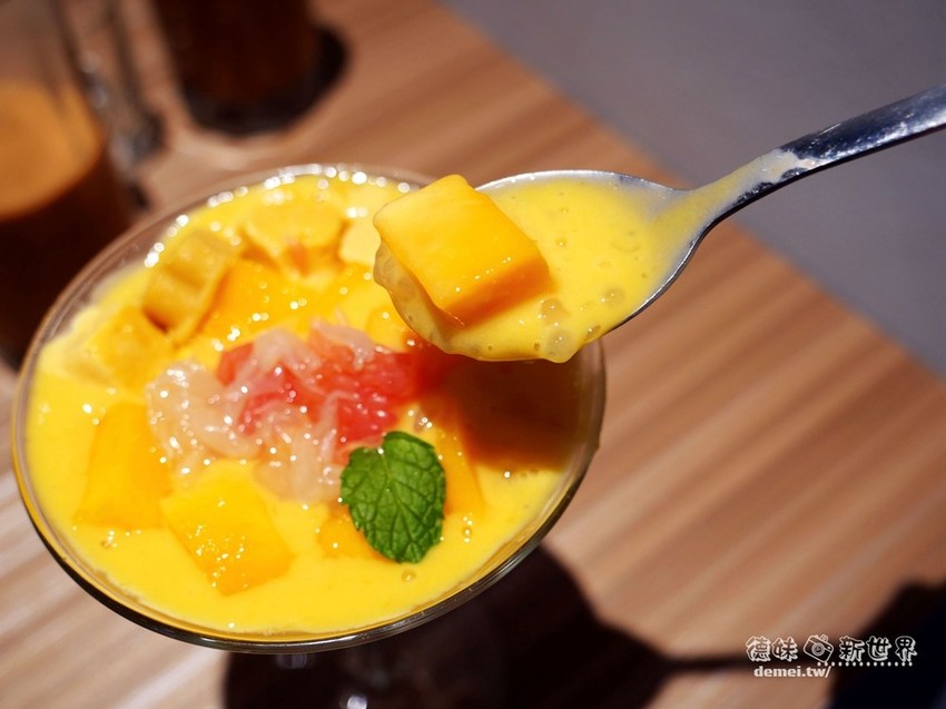 用新鮮芒果、泰國柚、美國葡萄柚混搭而成的楊枝甘露有季節性,甜而不膩滿是果香值得推薦。