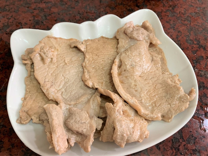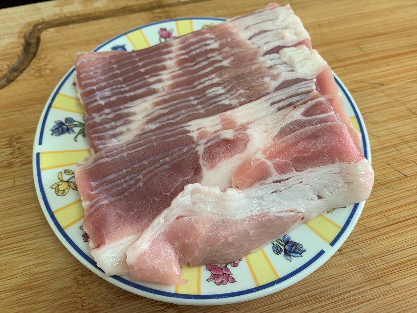五花肉片切的更薄,也是簡單用醬油、酒、薑片抓醃 一下,就可以料理了