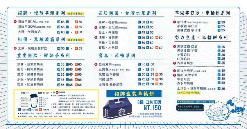 另一邊則是車輪餅菜單,有古早味奶油、黑糖波霸奶油、相思紅豆、慢熬大甲芋頭等口味,還有把草湖芋仔冰包入車輪餅中如同在吃芋仔冰甜點的口味。