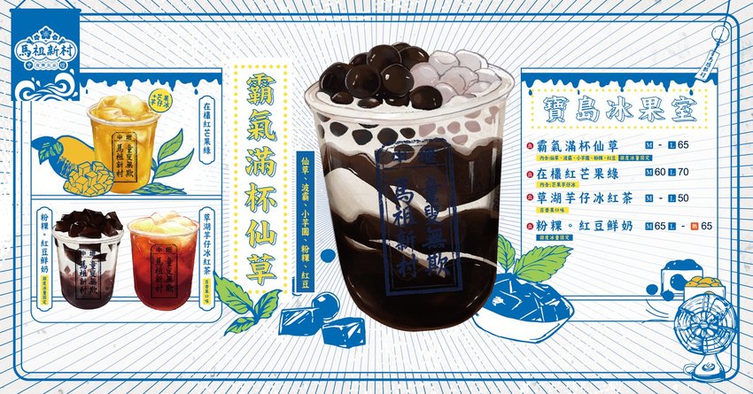 此外還有以芒果、仙草、粉粿、草湖芋仔冰等配料組成,呈現多元繽紛的寶島冰果室特調飲品。