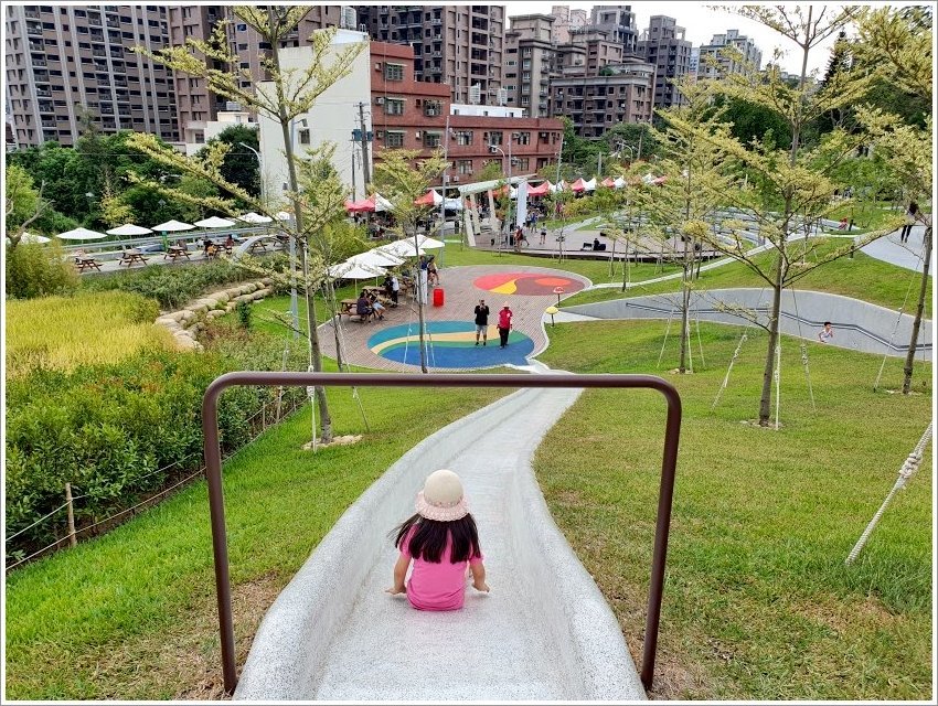 ▼這一條是比較長的溜滑梯,上頭還有輔助扶手,溜下去的風景也滿不錯的!!