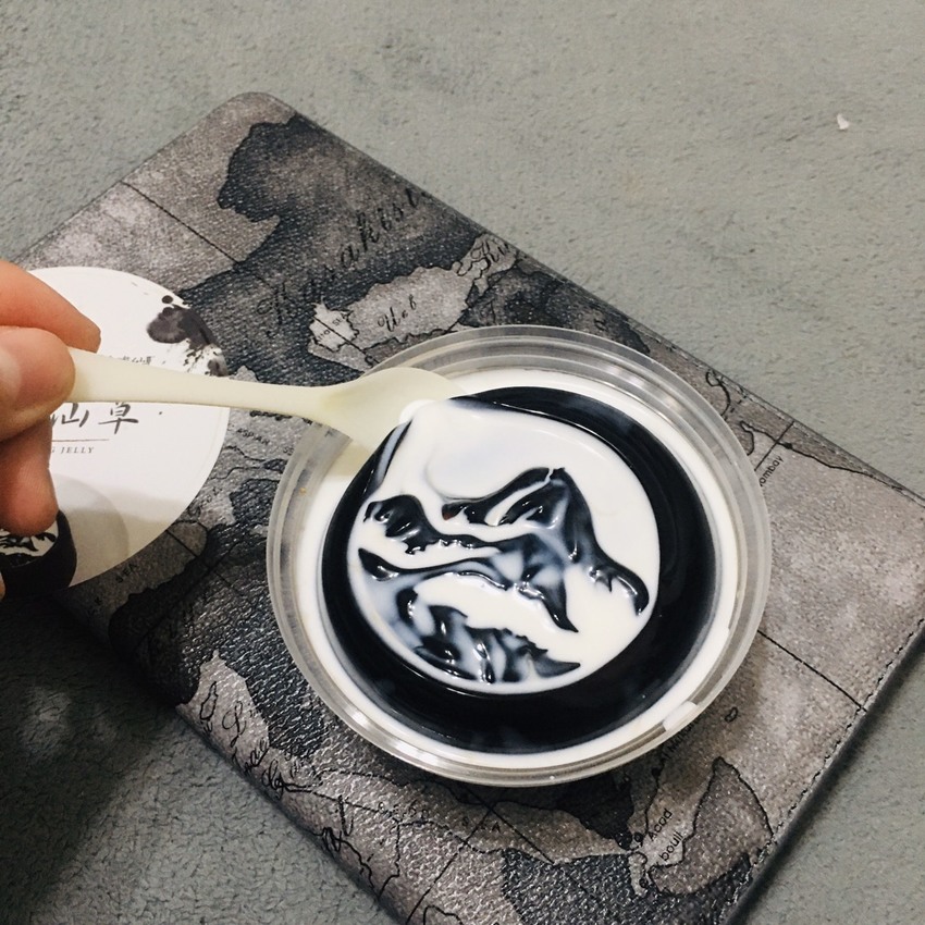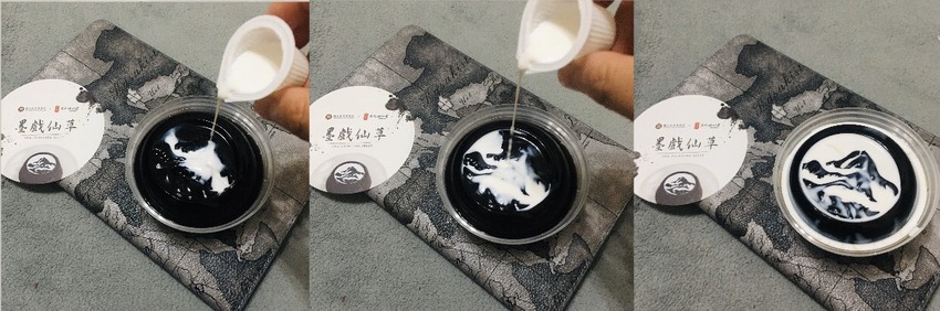 利用黑色仙草與白色奶球之間的對比,台灣道地甜點瞬間化身山水名畫,平常是配角的奶球成了整幅作品的精隨,使仙草凍的高低起伏成為了層層巒峰,奶精暈開後如同雲霧繚繞於山間,整個過程畫面非常療癒心靈。