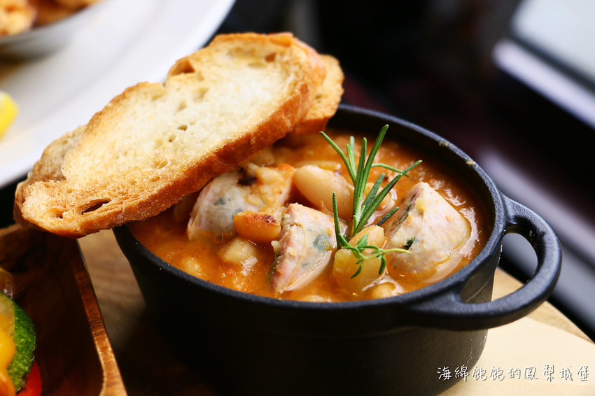 旁邊小小鑄鐵鍋裝著香腸嫩白腰豆,沾麵包超讚