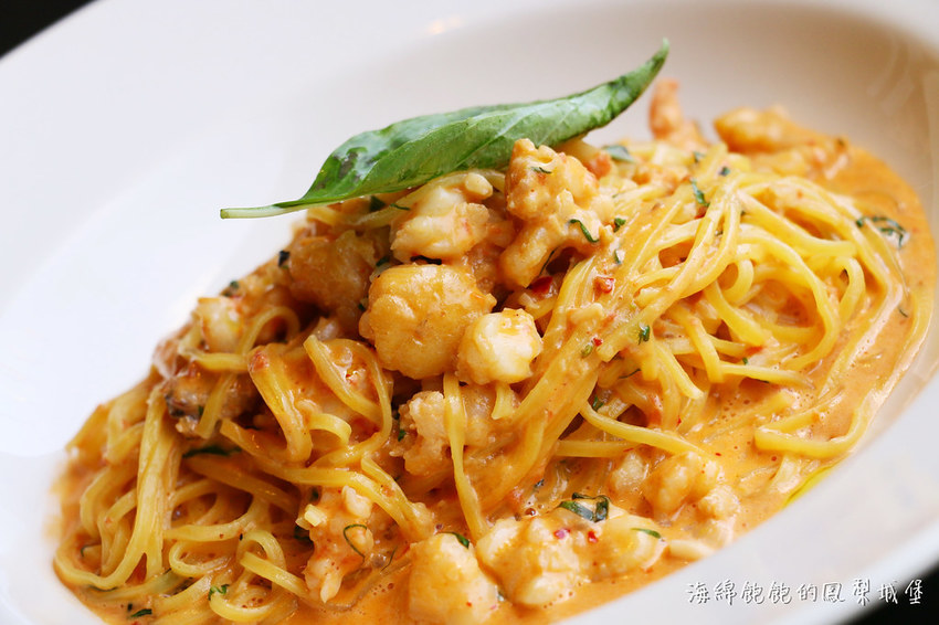 搭配粉紅醬汁(番茄紅醬+奶油白醬)襯出海鮮的甜!