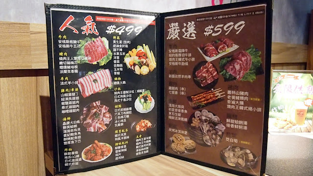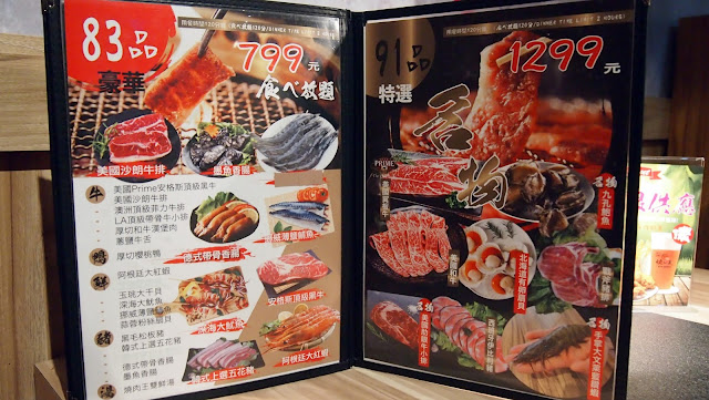 總共四頁菜單,最高價位91品還可吃到美國和牛、黑毛和牛、伊比利豬......等等品質好的肉品,最低價位499元其實很划算,也能吃得不錯,只是牛肉選擇較少而已,若不吃牛我很推薦499唷!!