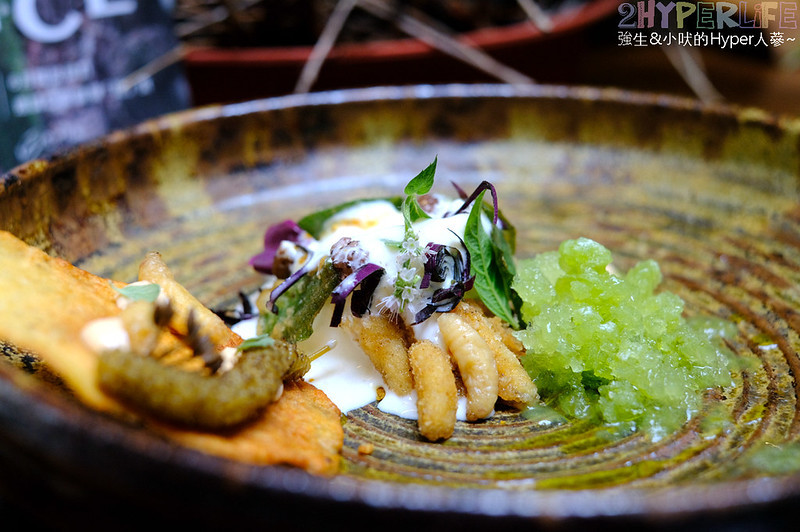 蜂蛹餅上是由綠轉黃的長條桑椹,先使用了蘋果醋做醃漬吃起來酸酸的爽口,一旁則是很營養的蜂蛹~蜂蛹分別有醃漬跟炸過,二種口感一次滿足喔哈哈!