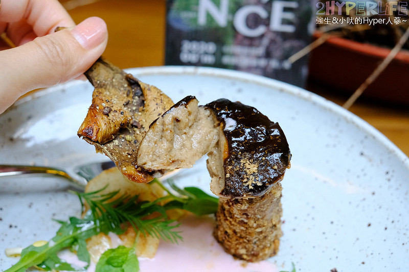 一旁則是以小黃瓜跟琴酒為主體做的晶球,底下以濃稠燕麥奶製作的醬汁酸酸甜甜的很爽口,晶球上頭還真的有一隻螞蟻喔!不用擔心完全是可以吃的蛋白質啦哈哈~