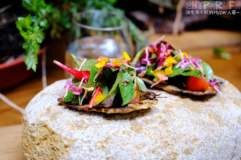 薄餅上以雜草作成沙拉為概念,佐以當季香草與花朵,搭配紅咖哩醬以及漬過的檸檬皮和自家製作的紫蘇醋再灑上香料,還有一個驚喜藏在其中~有找到了嗎?