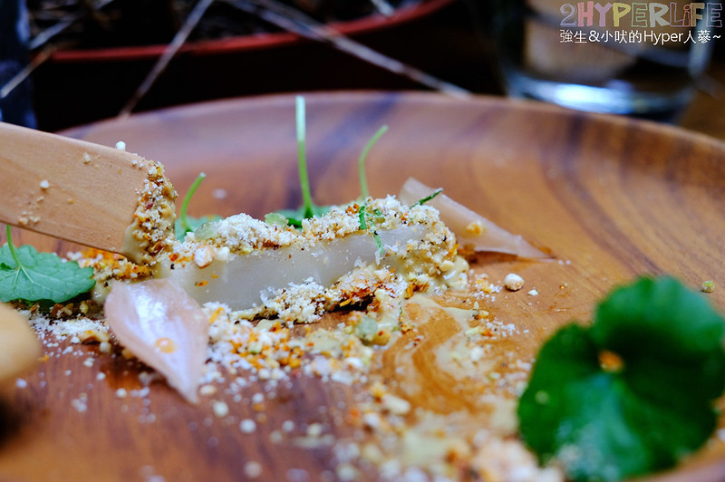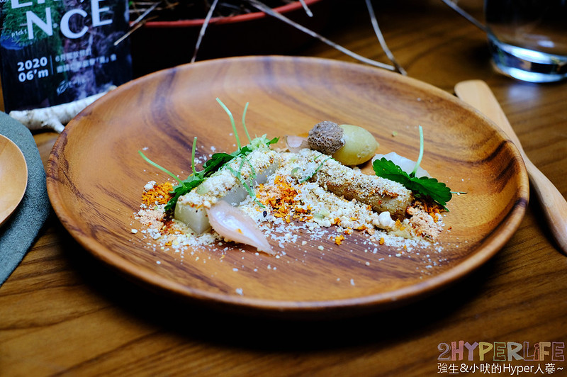 大自然中的樹木有著許多豐沛的食材,像是樹根、果實甚至是落葉都是可以入菜的元素之一;以蘿蔔跟牛蒡為主體,灑上以椰子粉跟其他香料做的粉末,佐以橄欖和腰果,搭配旱金蓮的葉子與花朵呈現出另一道讓人驚訝的獨特料理。