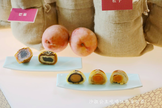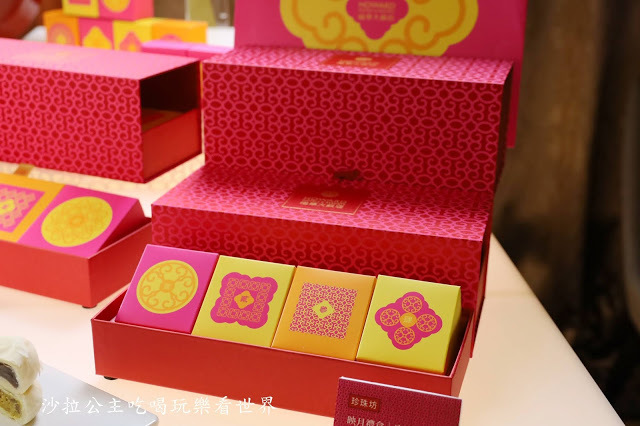珍珠坊廣式月餅(皓月禮盒 廣式中月餅6入/映月禮盒 廣式小月餅8入),捨棄傳統偏油膩的內餡,進行口味創新,在以往經典熱銷的"伍仁金腿"、"核桃棗泥"、"雙黃松子蓮蓉"外,今年主廚團隊研發四款新風味"吉柿芒果"、"覆盆子水果"、"靜岡抹茶紅豆栗子'及"五穀蔓越莓"等四款特製口味