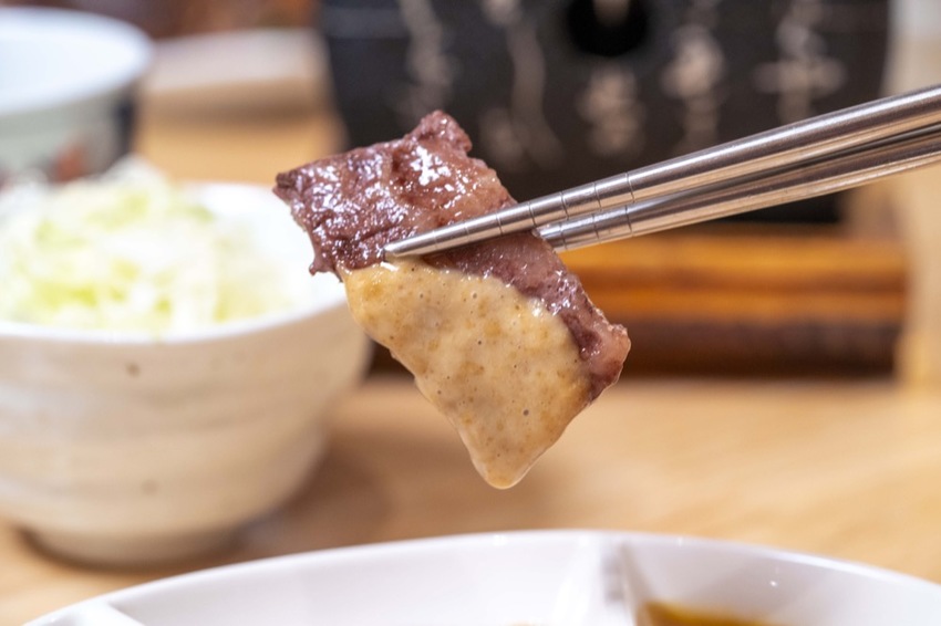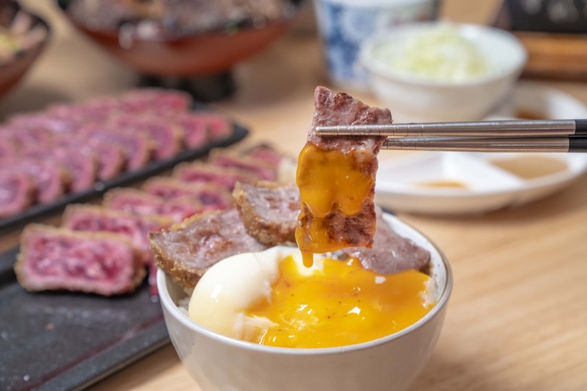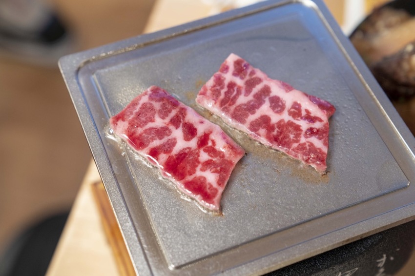 「霜降羽下肉」是使用牛肩胛的部位,豐富的油脂讓牛肉口感更加多汁軟嫩,即使煎至全熟,牛肉肉質也不會因此韌到無法下嚥。第一次看到牛肉建議全熟食用,看得出來店家對於自家牛肉品質非常有信心!