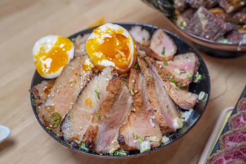 這道「神樣戰斧豬排丼飯」上桌時也很霸氣,使用台灣黑豬帶骨里肌的部位,直火燒烤制外層焦脆、肉質軟嫩,肉汁鹹甜鹹甜的滋味超級下飯!