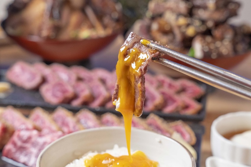 放置在一旁的小烤爐上,煎至自己喜歡的熟度,直接吃就已經很美味了,不過沾了一點溫泉蛋裡的半熟蛋黃一起吃,濃郁滑順的蛋黃與軟嫩鮮美的和牛一口吃進嘴裡,幸腹感瞬間大噴發,吃到笑容闔不起來~