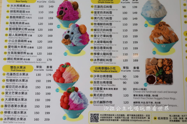 店內人氣商品就是熊家族系列的雪花冰,可以看到菜單上的價格,單點的話最貴的也就是130元,最便宜的100元,平常有在追網美打卡店的朋友就知道,這價位很親民
