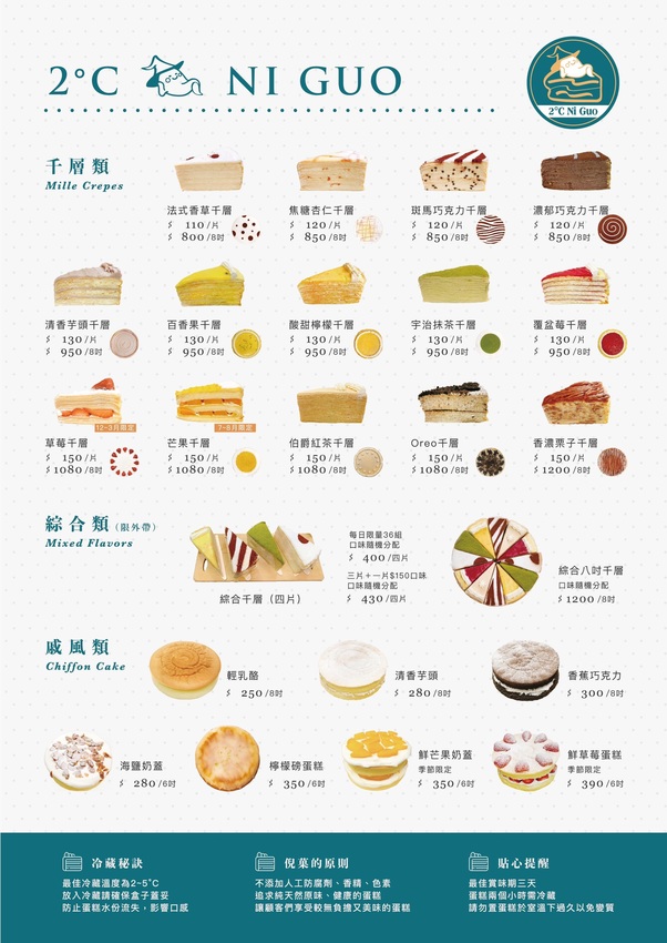2度C以千層蛋糕為主,堅持好食材融入千層蛋糕中,不斷地推陳出新,口味上有數十種可以做選擇,因此除了千層蛋糕外,另外還有輕乳酪蛋糕、檸檬磅蛋糕、戚風蛋糕。目前千層蛋糕的口味超過10種, 單片外帶價格110元~150元,相較於其他甜點店的千層蛋糕,這裡的價格非常平值甚至超值。綜合千層4片組400元、綜合季節4片組430元是他們家的人氣招牌,每天限量36組,沒有預約可是要碰運氣才能吃到。