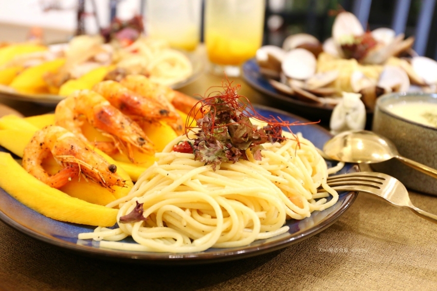 色香誘人的芒果鮮蝦辣炒義大利麵,簡單的調味,也將防果的甜味帶入了蝦裡,很獨特卻一點也不違和。