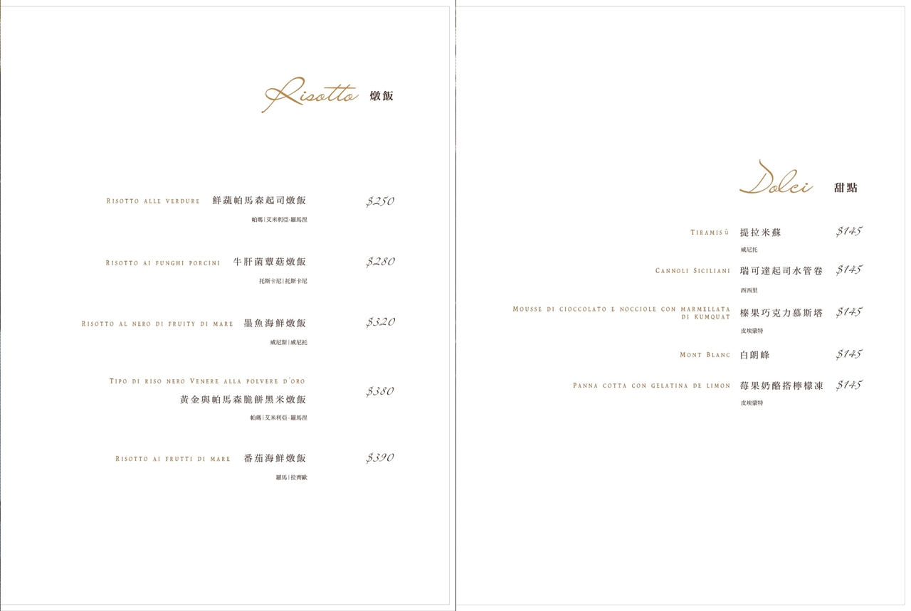 菜單本設計的很精緻,餐點看起來也很多樣化。除了義大利麵、燉飯、沙拉等傳統義式料理之外,還有窯烤的披薩(小哥的精彩表演)、手製的義大利麵餃、店內特製的主排餐等,選擇性相當多。以下附上菜單,每道菜名右邊皆有標示它的菜色來源(義大利區域名),呼應店名的 Venti 20,很有趣的細節。Trattoria Venti 食記