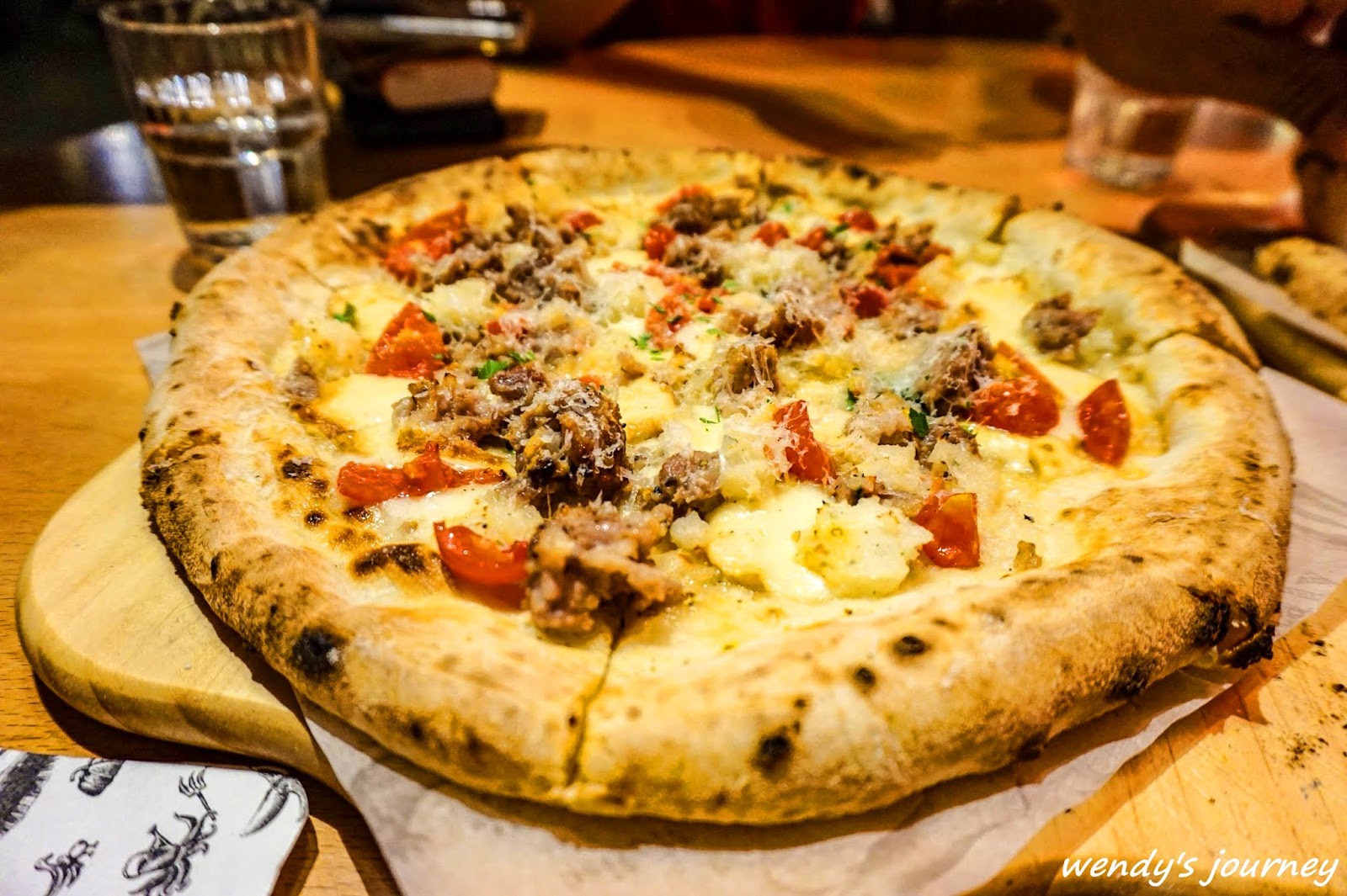 以馬鈴薯、波蘿伏洛起司、肉腸、小番茄、羅勒葉為食材,一樣是薄餅皮,這一道吃起來比較有飽足感,大概是因為有肉的關係吧 😂