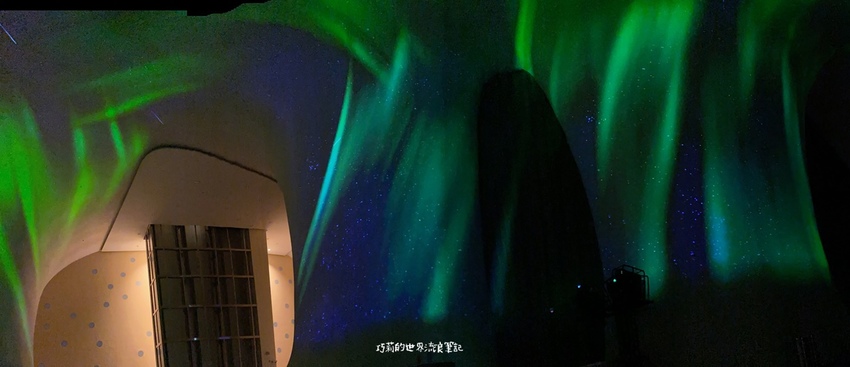 中午12:30開始,每個半點是極光+星空的演出,總長8分鐘,極光及星空的演出時間大約是一半一半,首先看到的是滿天星斗,原本平淡無奇的牆面,一瞬間好像整個銀河系都把你包圍,黑夜之中是如此明亮閃爍。