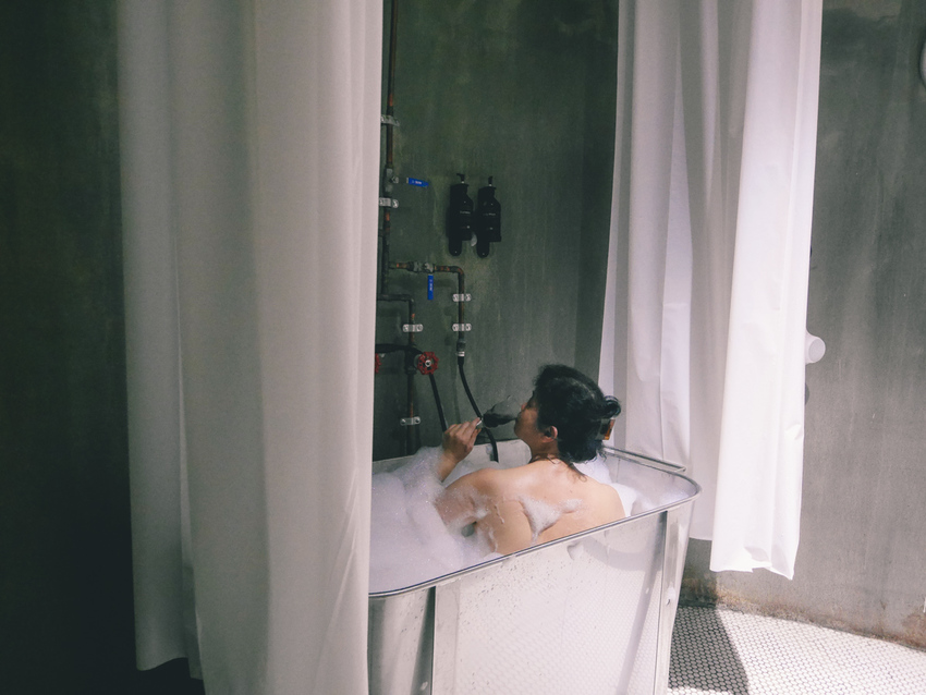 也許很多人都非常好奇,這種把廢棄煙囪切割下來的加以改建的民宿,裡頭到底是以什麼樣貌呈現。高塔的總共區分為三層,最出乎意料是打開門的第一層,竟然是衛浴空間。濃厚的工業風格在室內空間蔓延開來。