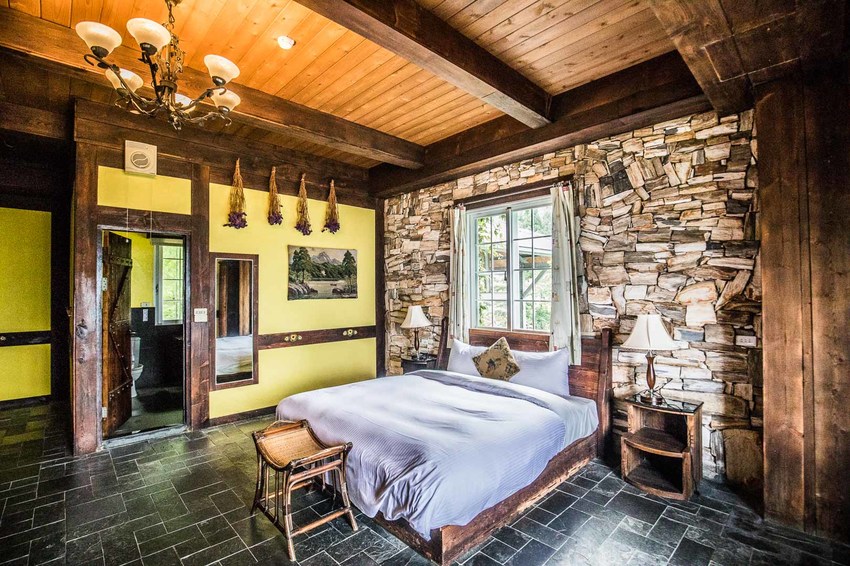 走進接待大廳,彷彿就此進入古堡般的奢華空間感,運用大量的木製裝潢及大片石壁拼接,給人一種低調但有氣勢的感覺,天花板也有許多薰衣草的乾燥花,平添幾許歐洲鄉村風的悠閒度假氛圍