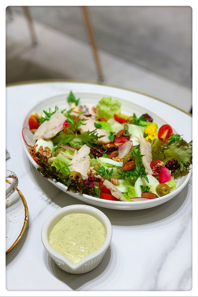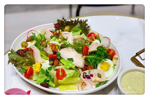 有雞胸肉、生菜、蕃茄、水煮蛋及多種不同的堅果