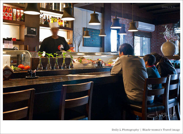 餐廳內部是紅磚與木造混合空間,中午時段的光影與氣氛就已經不錯,想必晚間的感覺更佳吧!雖名為居酒屋,不過桃桃覺得這裡其實是台式復古風,大概屬吧檯區比較有日式調調。