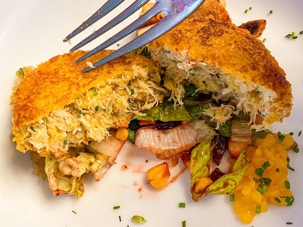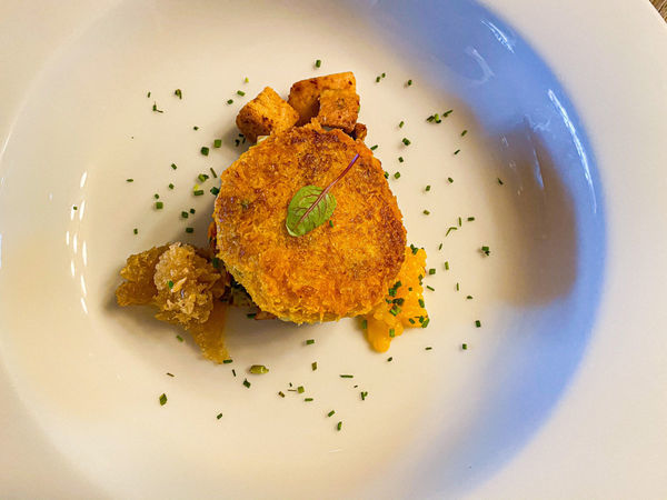 加州式的可樂餅+沙拉,可樂餅竟然是以藍鑽蟹肉製作的!將肉餅包裹薄薄的麵包粉後下鍋煎,吃起來很清爽可口!平常可樂餅算是日式風味,搭配蟹肉口感也很棒耶完全不突兀,配上清爽的酸膜草拌沙拉酸甜更提升鮮度!佐以三種主廚的特色配菜:涼拌海蜇頭、南瓜泥魚子醬、青花椒麵包丁,南瓜泥魚子醬是以分子料理方式製成甜甜的搭配很可以。