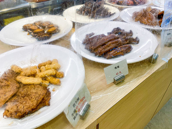 當天一到點看到滿滿的滷味還有各式食品、外帶菜色等等,整個令人食指大動~先給大家看看各式好吃的美食,生意很好看到很多客人都夾滿滿一盤呢!