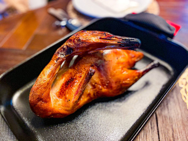嚴選28天大的baby鴨,經過3~4天的製程,包含風乾、淋上糖衣水、醃漬...等繁瑣的料理工藝,所以製程真的很繁複