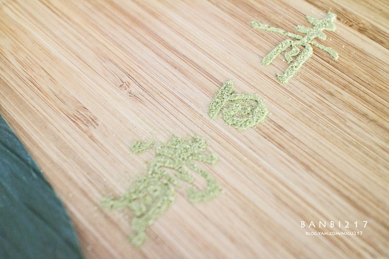 木盤上的「青田賞」三字是用抹茶粉繪製成的。