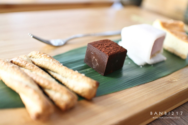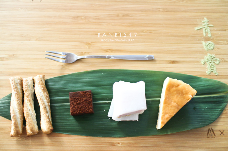 由左而右依序是爽脆的海苔煎餅、香濃柔軟的生巧克力、如同大福與冰淇淋口感的麻糬起士蛋糕、輕柔入口即化的起士蛋糕所組成的甜點協奏曲。