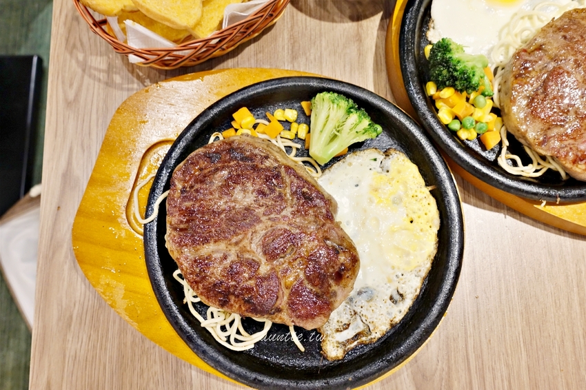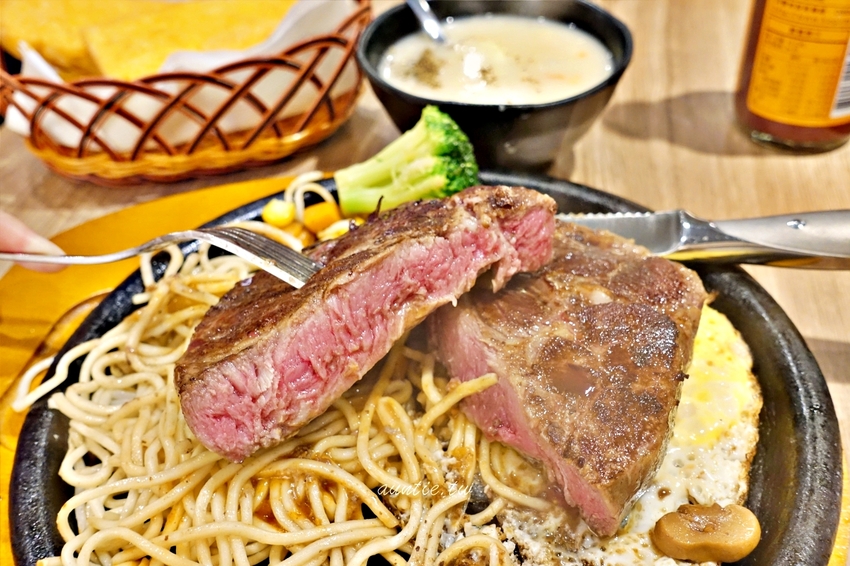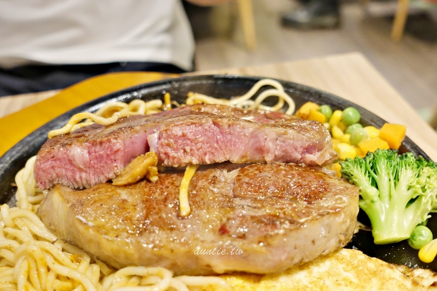 五分熟半生熟狀態,因為鐵板很燙,所以熟度還會更增加。牛肩肉的口感挺嫩的,而且是軟軟QQ的,沒有什麼筋,口感味道都還不錯,至少比孫XX好吃,認真!
