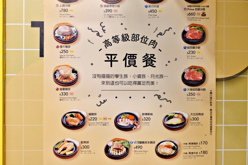 爭厚厚切牛排點主餐就有免費的濃湯、麵包、冰淇淋飲料等等,餐點價格從單純牛雞豬到海陸大餐都有,價格落差也挺大的,不過自己每次都點最便宜的牛排,約290~390價位的,因為覺得再貴的話寧願去高級一點的牛排店吃呀,來這其實就只是想吃肉而已😂!官網菜單