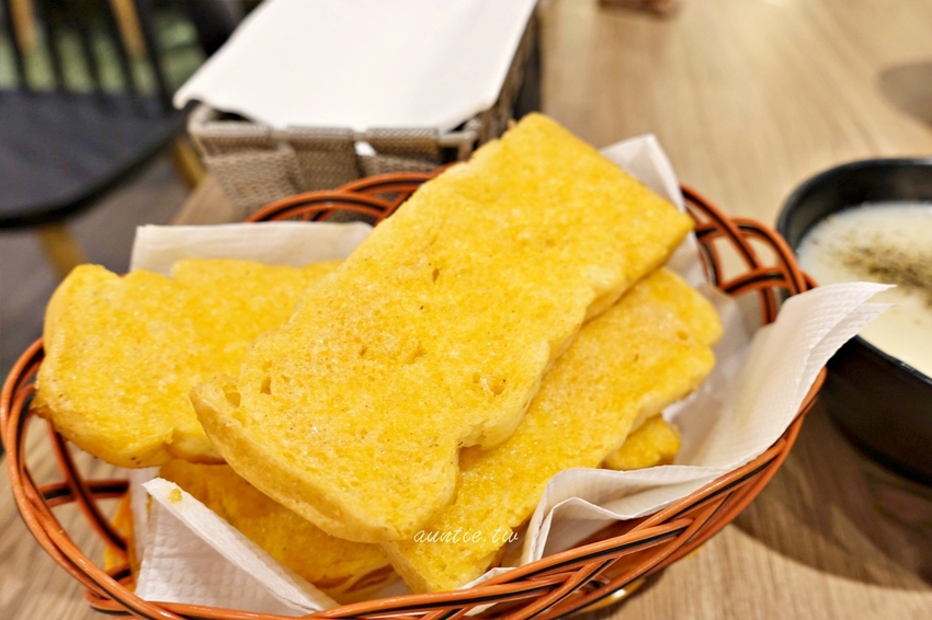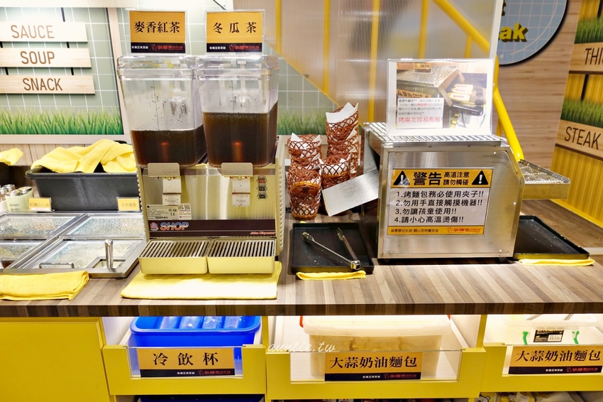 自助吧台有飲料跟大蒜奶油麵包,麵包味道還不錯,沒人排隊等著拿的話都會連烤兩次,比較酥脆一點,另外還有玉米濃湯、牛排醬汁,不沾醬的話也有玫瑰鹽可以沾,其實個人最愛的就是沾番茄醬,哈哈小朋友口味呀!