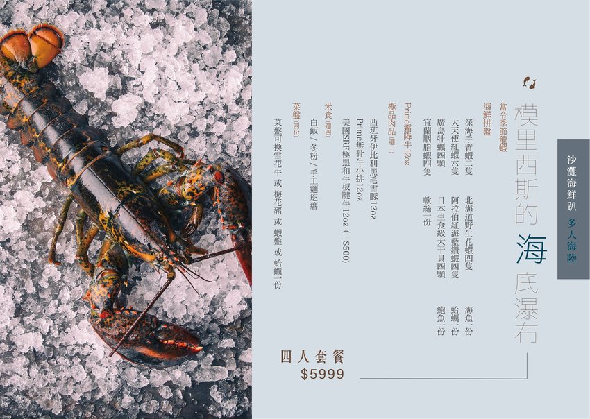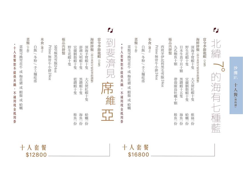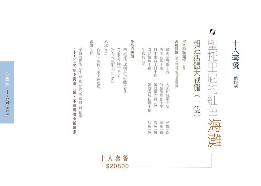 鍋物部分提供個人鍋物套餐,也有雙人套餐、三人套餐、四人套餐跟十人套餐(十人海陸套餐需要提前一週預訂)。