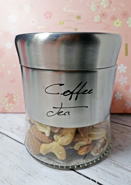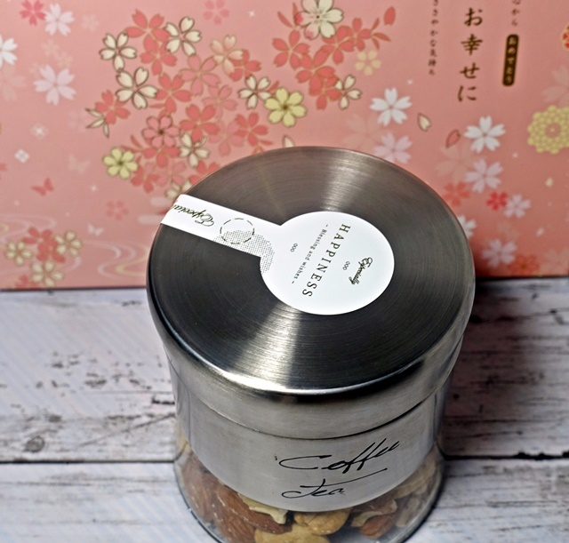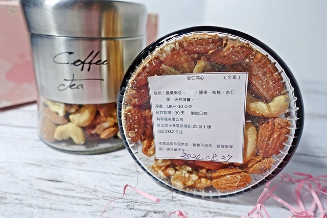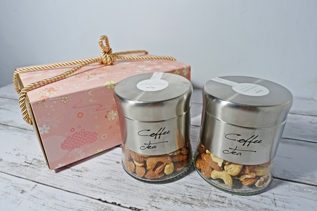 兩大罐綜合堅果,玻璃罐裝很有質感,食用完畢後再拿來當置物罐、咖啡豆罐都很實用。