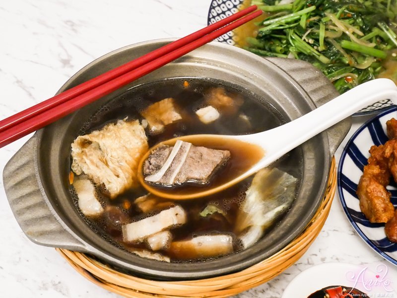 以帶骨的大骨配合中藥包燉煮而成,湯喝起來相當甘甜並且帶著淡淡的中藥香味,
