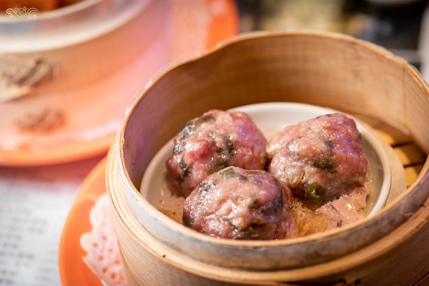 腐竹牛肉丸是很常見的熱門港式茶點,也是港式點心師傅的必考題之一。油炸過呈現金黃色的腐竹上,擺了三顆油亮亮的牛肉丸子,再淋上少許增加鮮味的喼汁。手工剁爛的牛肉,混合香菜碎、馬蹄碎等食材製作的丸子,鬆軟鮮嫩易入口,搭著已蒸得入口即化的腐竹,值得細細品味。