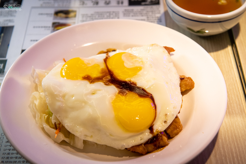 嚐一口米飯,那個香氣、口感與滋味,就讓凌雲想起在香港旅遊時的回憶。三顆半熟蛋相當吸睛,全磋破後蛋液跟著米飯一起混合,馥郁的蛋香一股腦的衝入鼻腔,卻沒有喧賓奪主,那份粘稠香濃減輕了豬扒餐肉的油膩。
