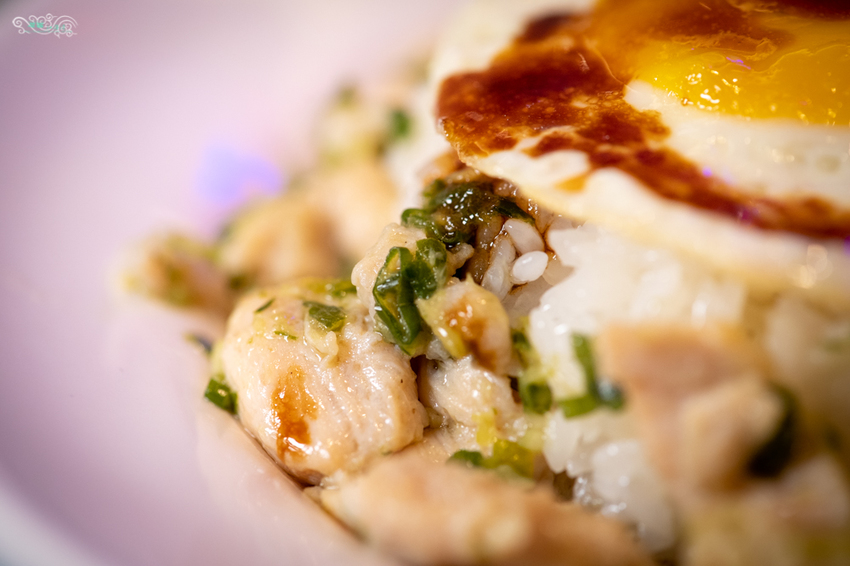 加入薑蔥拌過的雞胸肉,滑嫩可口,馥郁甘腴的肉香,挑逗著味蕾神經,打上一顆黃金蛋,就是道地的美味香港小吃。